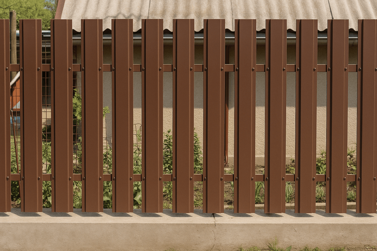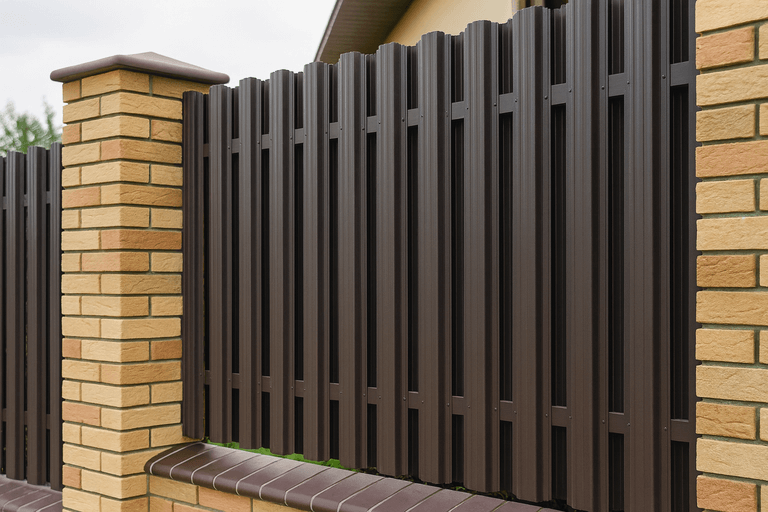 Забор из металлического штакетника — это надежное и эстетичное ограждение, подходящее как для частных домов, так и для промышленных объектов. Конструкция представляет собой набор вертикальных металлических ламелей, закрепленных на поперечные лаги, установленные на столбы.